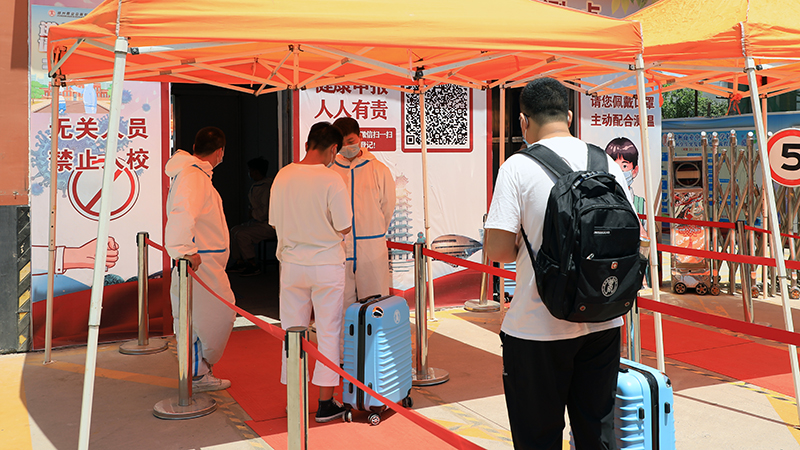 返校學(xué)生分時段、分批次在學(xué)校值勤教師、安保人員、學(xué)校醫(yī)護(hù)人員和班主任的熱心引導(dǎo)下,按1.5米間距進(jìn)行身份信息核查、健康碼核驗,在學(xué)生完成校外消毒、免水洗手消毒、人工消毒通道、行李消殺、熱成像紅外線人體測溫儀等規(guī)定流程的多層檢測后進(jìn)入順利校園,整個返校報到現(xiàn)場平穩(wěn)有序。